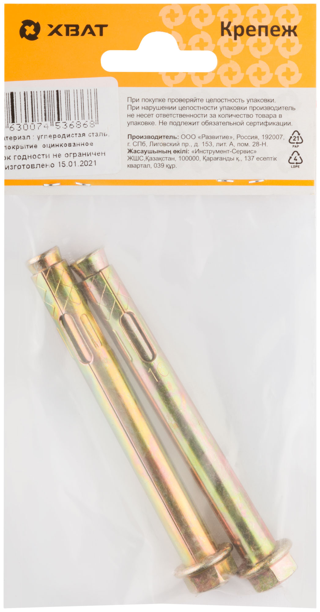 Втулка, шпилька с конусом и гайка изготовлены из стали с электроцинкованным покрытием желтого цвета. Применяется для крепления различных тяжеловесных конструкций в полнотелых материалах (бетон, корпич, естественный камень).