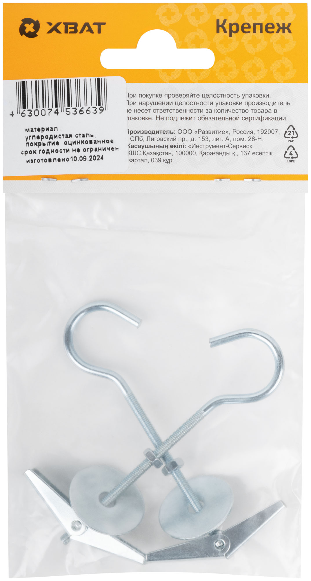 Изготовлен из стали с гальваническим цинковым покрытием, винт с крюком - стальной с гальваническим цинковым покрытием и метрической резьбой. Применяется для крепления легких конструкций к гипсокартонным плитам и другим пустотелым конструкциям.