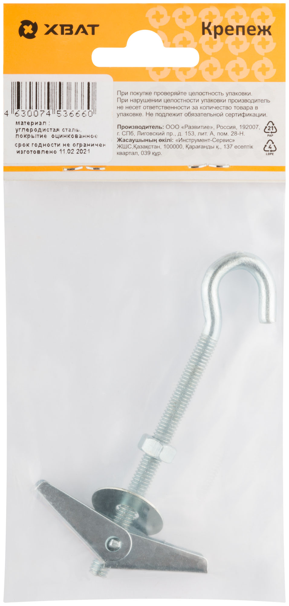 Изготовлен из стали с гальваническим цинковым покрытием, винт с крюком - стальной с гальваническим цинковым покрытием и метрической резьбой. Применяется для крепления легких конструкций к гипсокартонным плитам и другим пустотелым конструкциям.