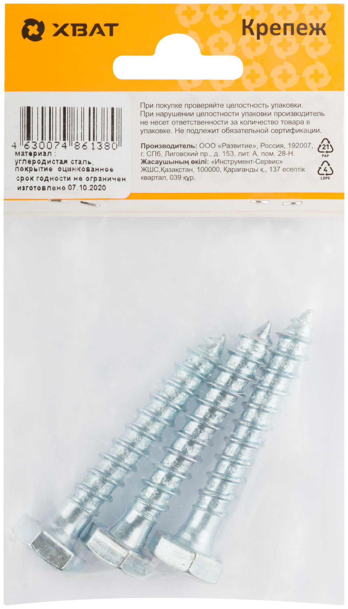 Шестигранная головка D=10/12/14/19. Редкий шаг резьбы под углом 600, острый наконечник, изготовлен из стали. Оцинкованный. Применяется для крепления лаг, реек, сборки деревянных конструкций, сантехнических креплений и других целей, когда требуется мощное закрепление. Используется также совместно с пластмассовыми и металлическими универсальными дюбелями.