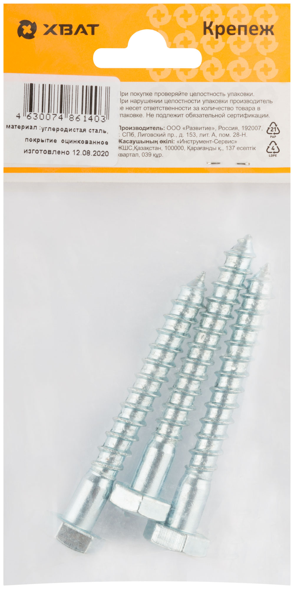 Шестигранная головка D=10/12/14/19. Редкий шаг резьбы под углом 600, острый наконечник, изготовлен из стали. Оцинкованный. Применяется для крепления лаг, реек, сборки деревянных конструкций, сантехнических креплений и других целей, когда требуется мощное закрепление. Используется также совместно с пластмассовыми и металлическими универсальными дюбелями.