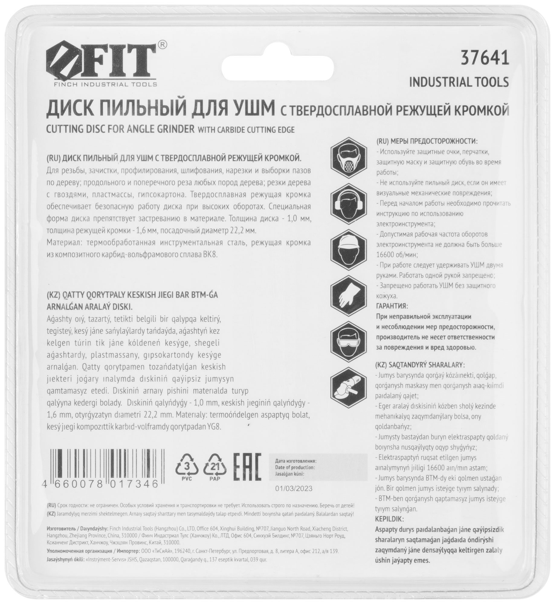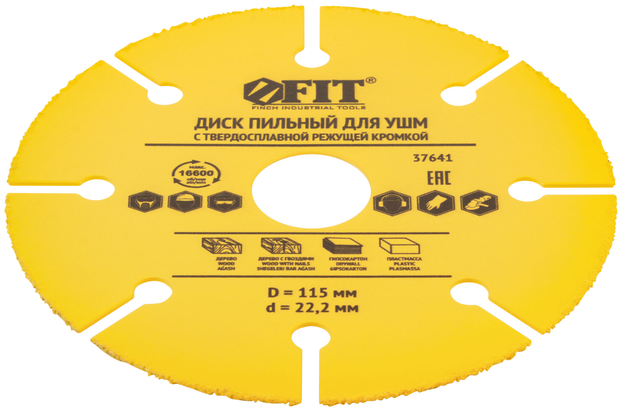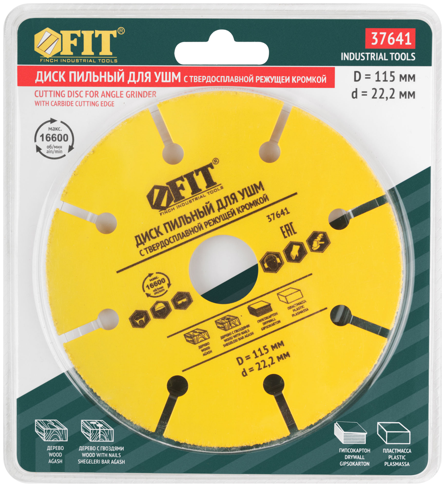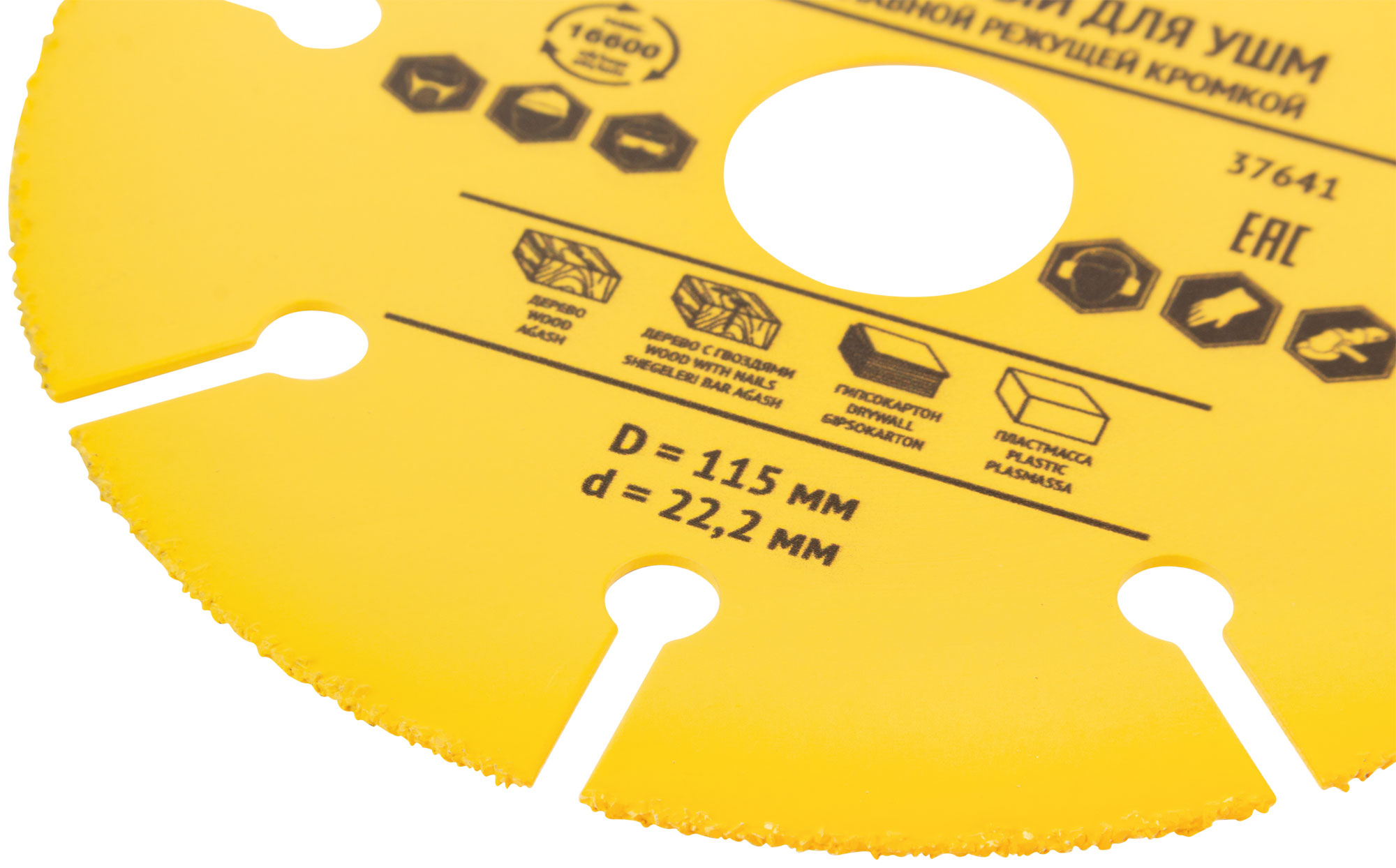 С твердосплавной режущей кромкой. Используется для резьбы, зачистки, профилирования, шлифования, нарезки и выборки пазов по дереву, продольного и поперечного реза любых пород дерева; резки дерева с гвоздями, ламината, пластмассы, гипсокартона. Для углошлифовальных машин. Посадочный диаметр 22,2 мм. Специальная форма диска препятствует застреванию в материале. Толщина режущей кромки: 1,6 мм у 37641, 37642 и 2,3 мм у 37645. Специально для больших оборотов. Материал: инструментальная сталь, режущая кромка из карбида вольфрама. 9овка: блистер.