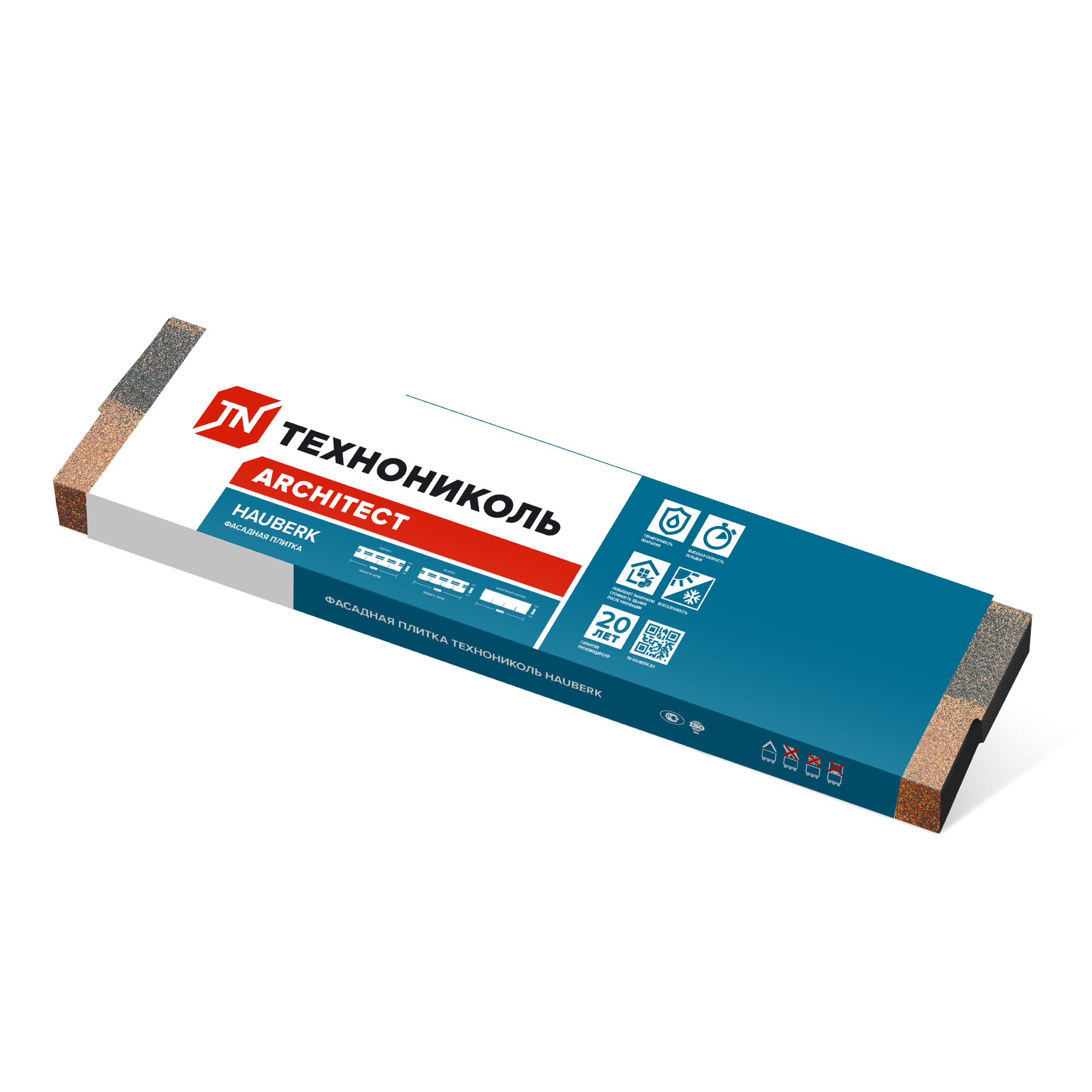 Фасадная плитка ТЕХНОНИКОЛЬ HAUBERK серии "Кирпич" изготовлена на основе стеклохолста и пропитана битумом, модифицированным СБС. Лицевая сторона материала имеет покрытие из базальтового гранулята, а нижняя посыпана кварцевым песком.