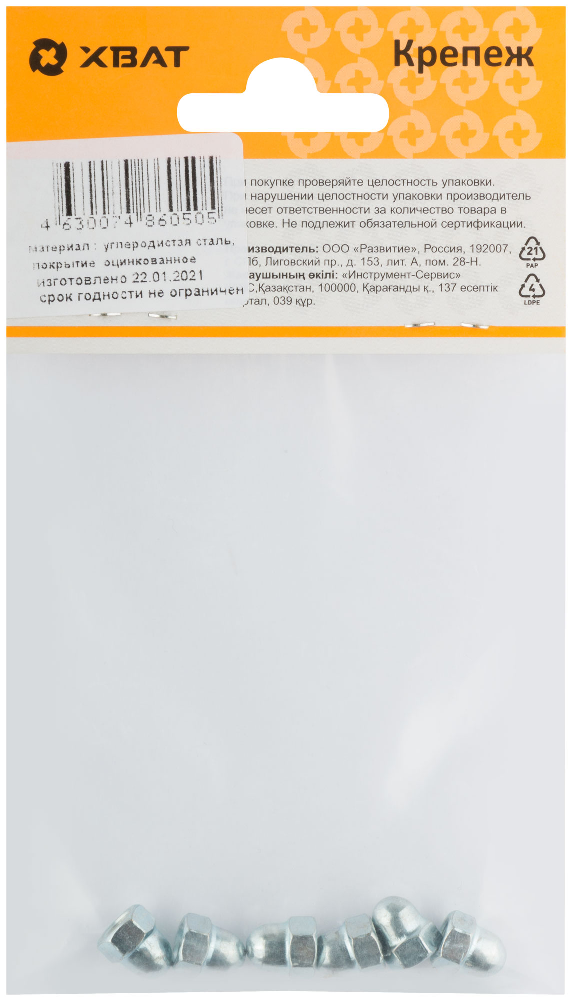 Оцинкованная. Колпачок гайки защищает резьбу от механических повреждений и коррозии, предохраняет от получения травм, а также улучшает внешний вид соединения.