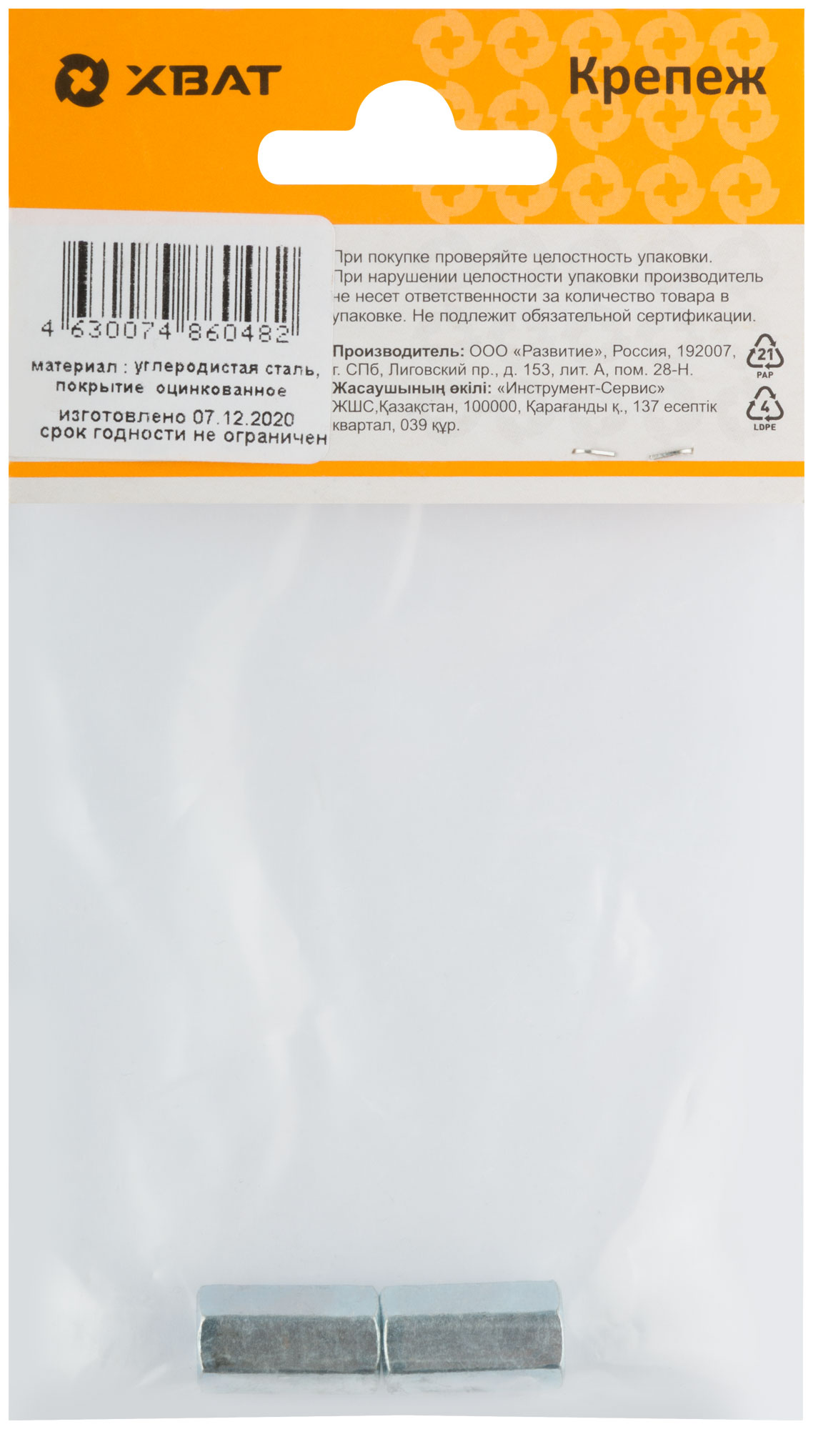 Изготовлена из конструкционной оцинкованной стали. Рекомендуется для соединения нестандартного метрического крепежа, например 10анг между собой. Длина гайки равна примерно трем её диаметрам.