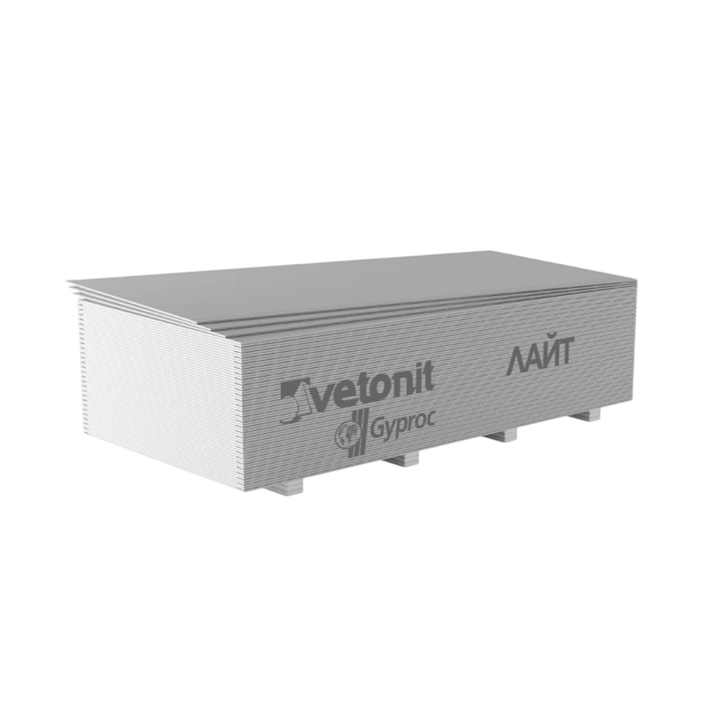 Vetonit Gyproc Лайт 2500х1200х9,5 мм — облегчённый лист для потолков и лёгких внутренних конструкций в сухих помещениях. Подходит для внутренних работ и последующей отделки. Источник характеристик линейки: https://www.gyproc.ru/produkciya/gipsovye-stroitelnye-plity/gsp-vetonit-gyproc-layt-oblegchennyy