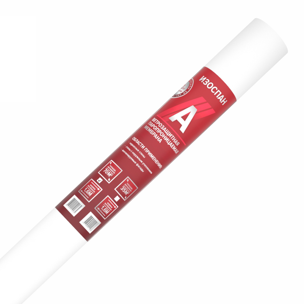 Ветрозащитная мембрана Изоспан A препятствует конвективному движению воздуха через теплоизоляцию, снижая теплопотери. Изоспан A обладает водоупорностью, достаточной для защиты утеплителя и других внутренних элементов конструкций стен от атмосферных осадков, проникающих под наружную обшивку, при этом является паропроницаемым материалом, поэтому не препятствует выходу водяных паров из утеплителя в вентилируемый зазор. Прочность материала способствует устойчивости к механическим нагрузкам на этапе монтажа и в процессе эксплуатации.