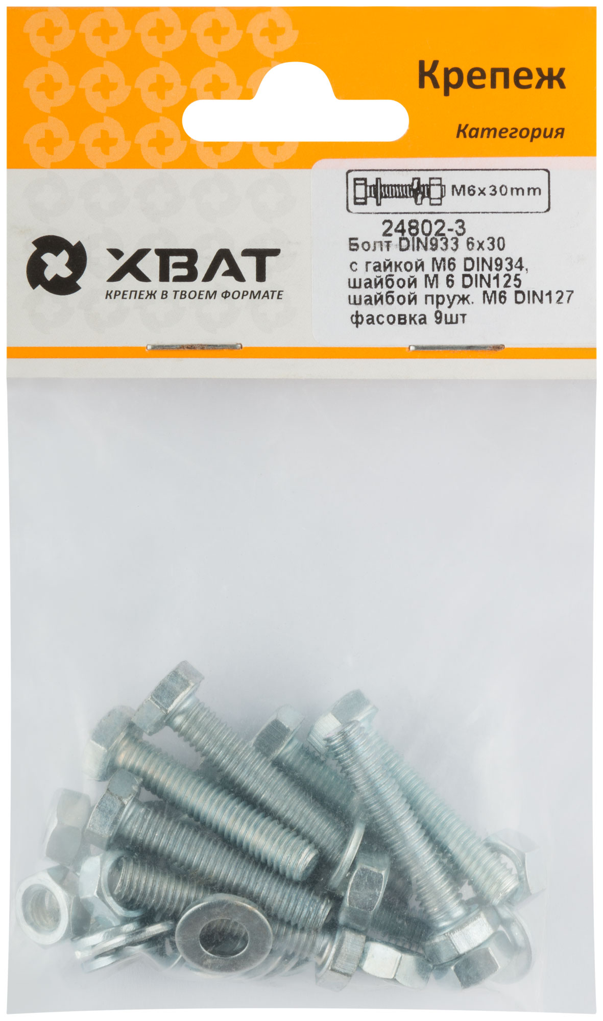 Купить Комплект:Болт DIN933 6х30, с гайкой М6 DIN934, шайбой М 6 DIN125, шайбой пруж. М6 DIN127 (фасовка 9 по доступной цене в Москве