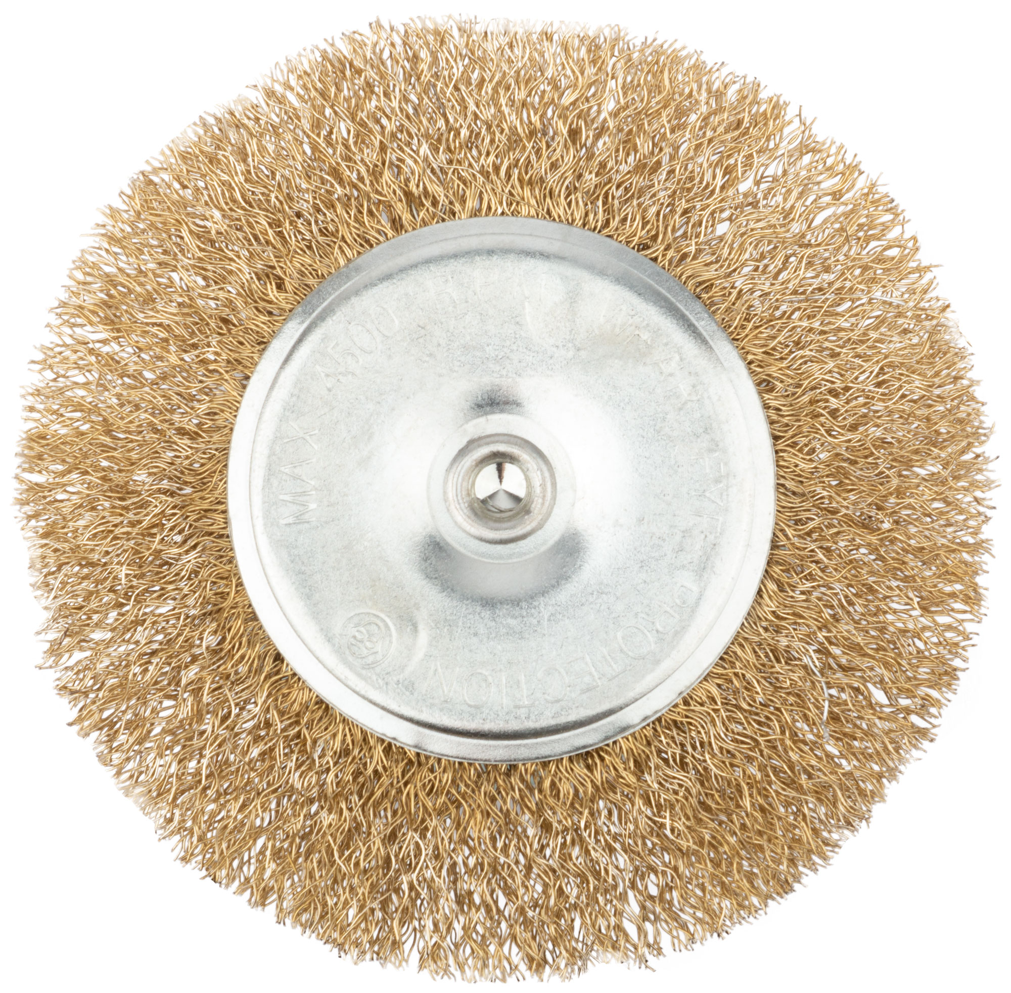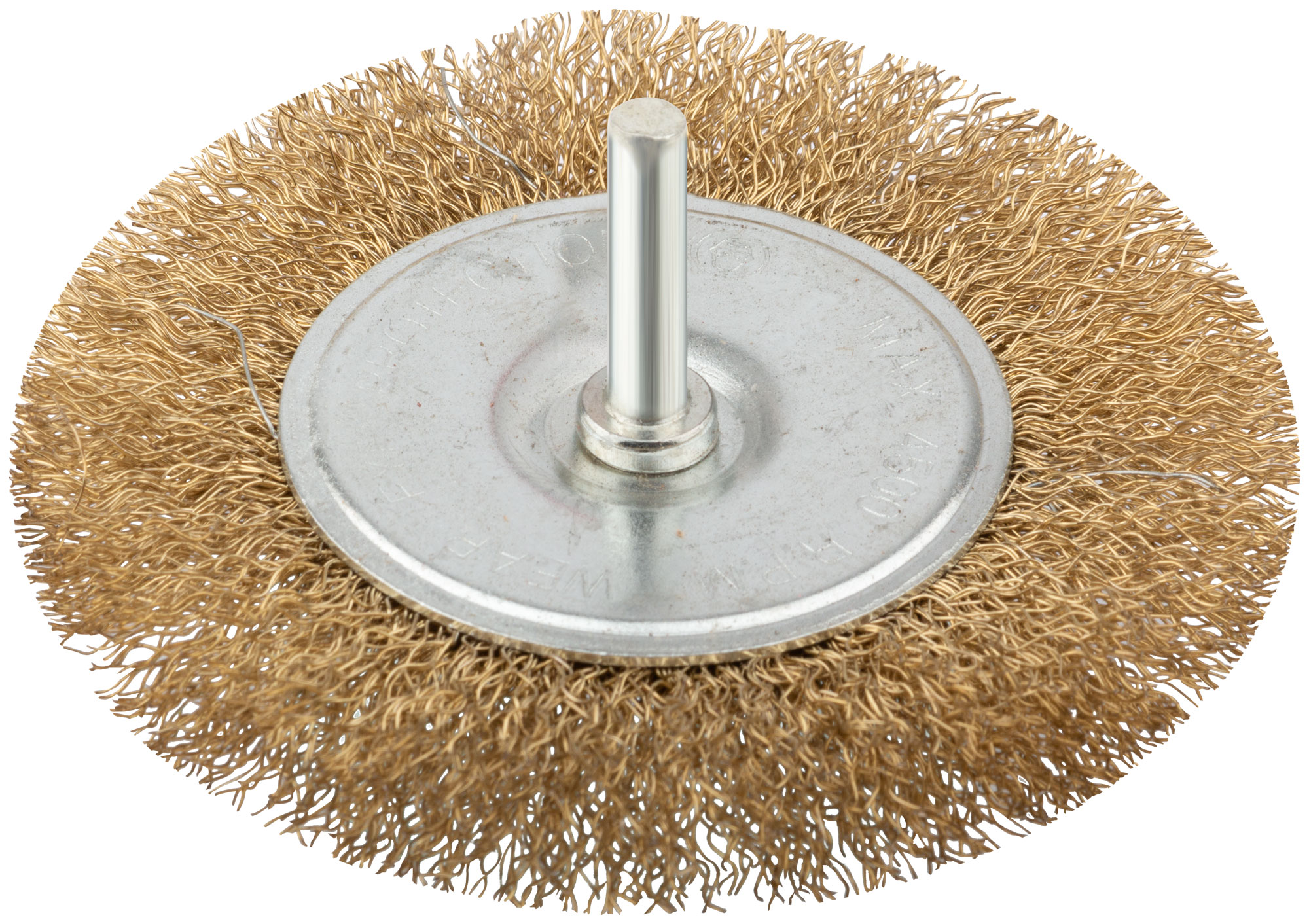Купить Корщетка дисковая прямая, со шпилькой, стальная латунированная волнистая проволока 100 мм по доступной цене в Москве