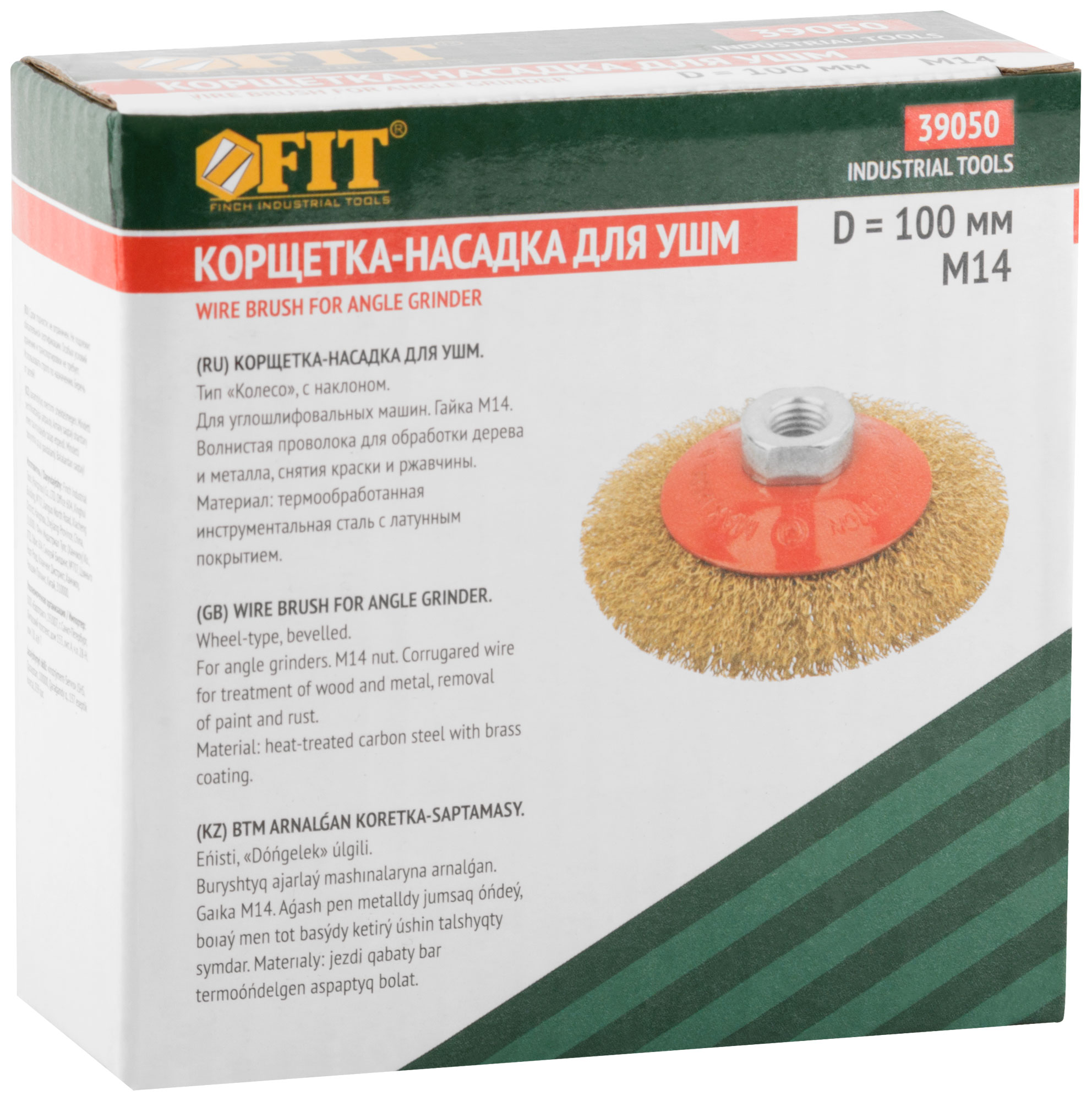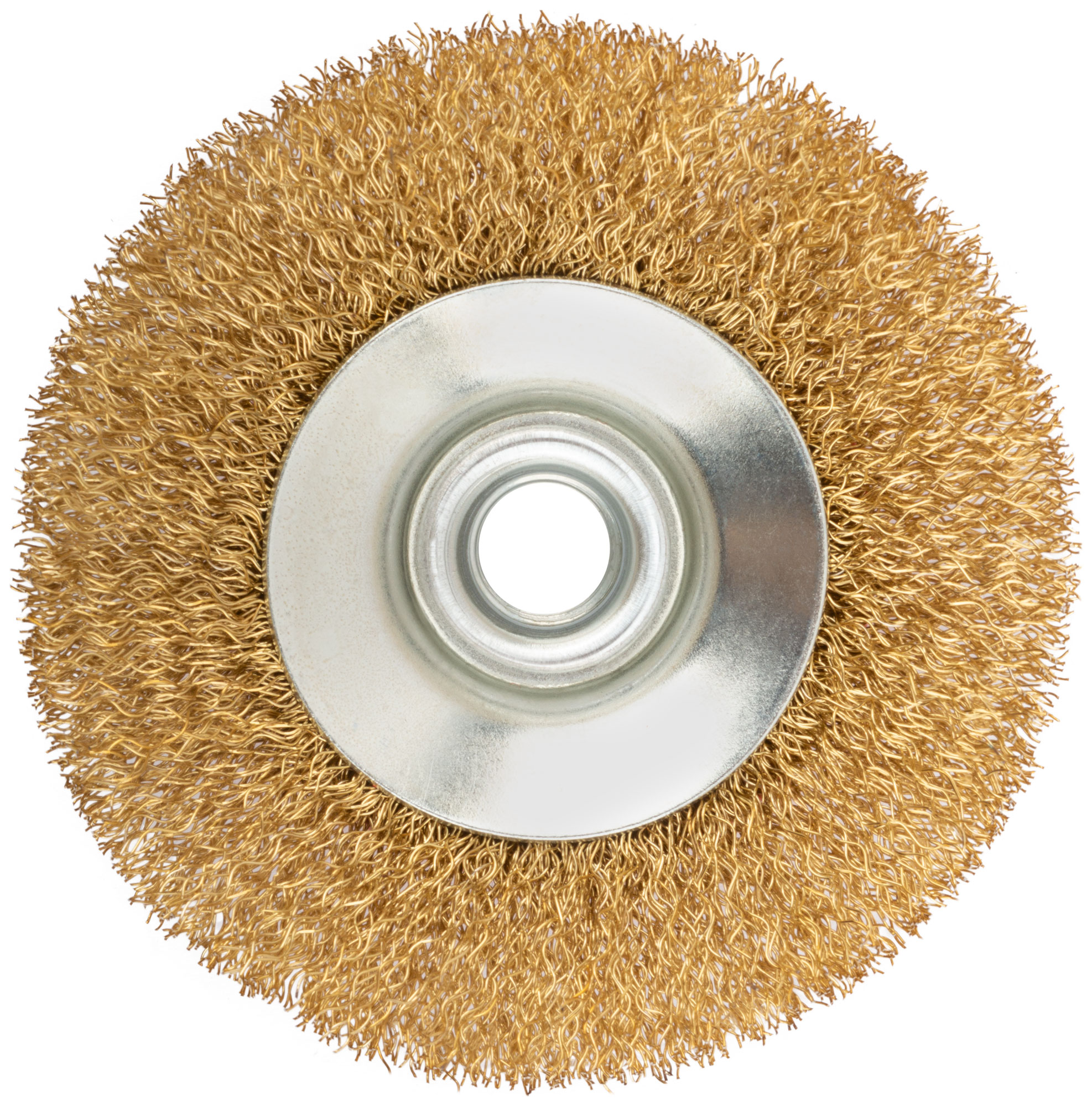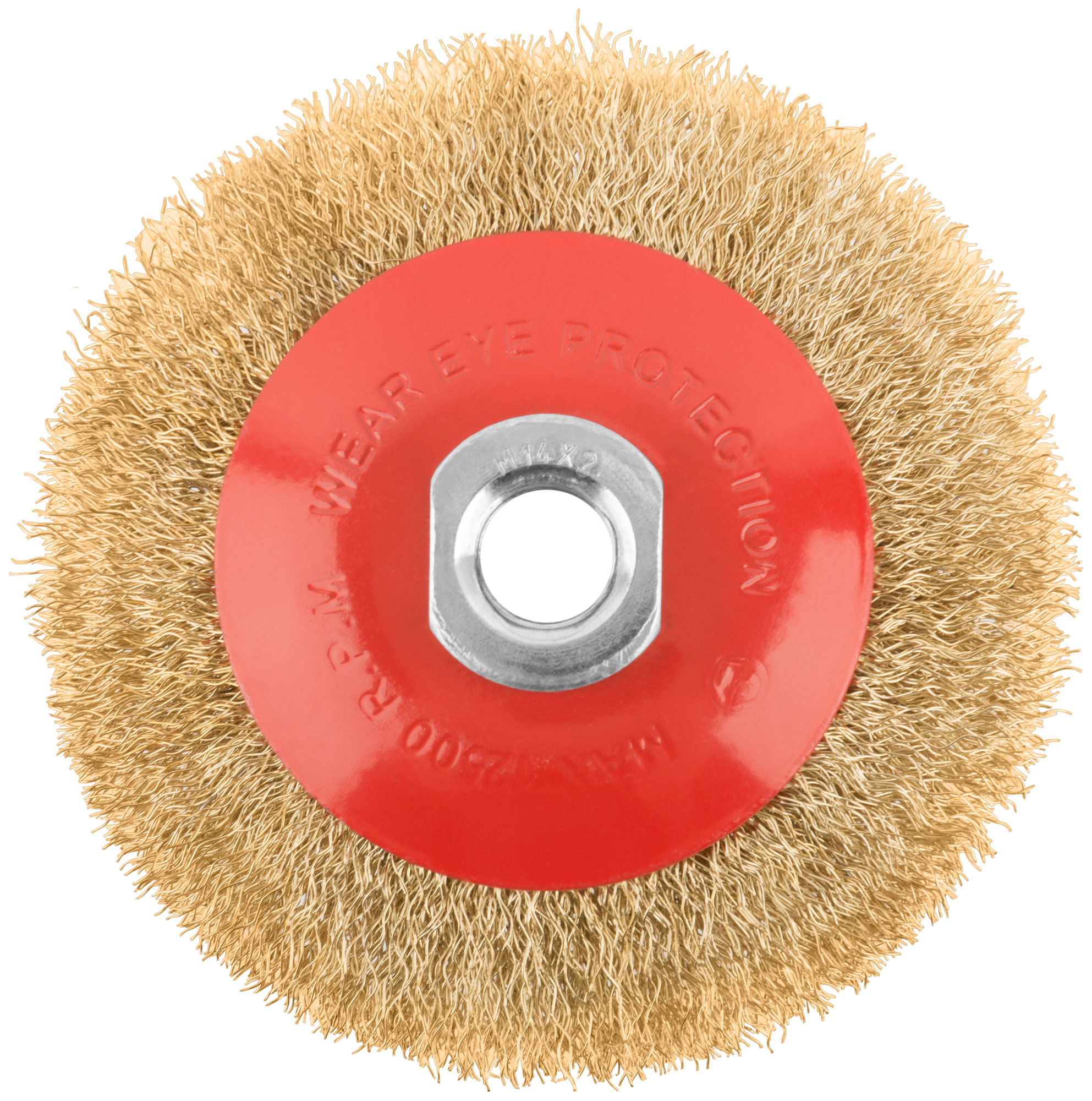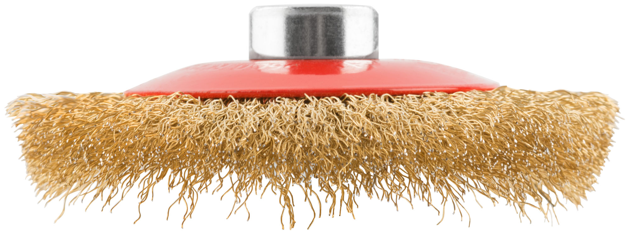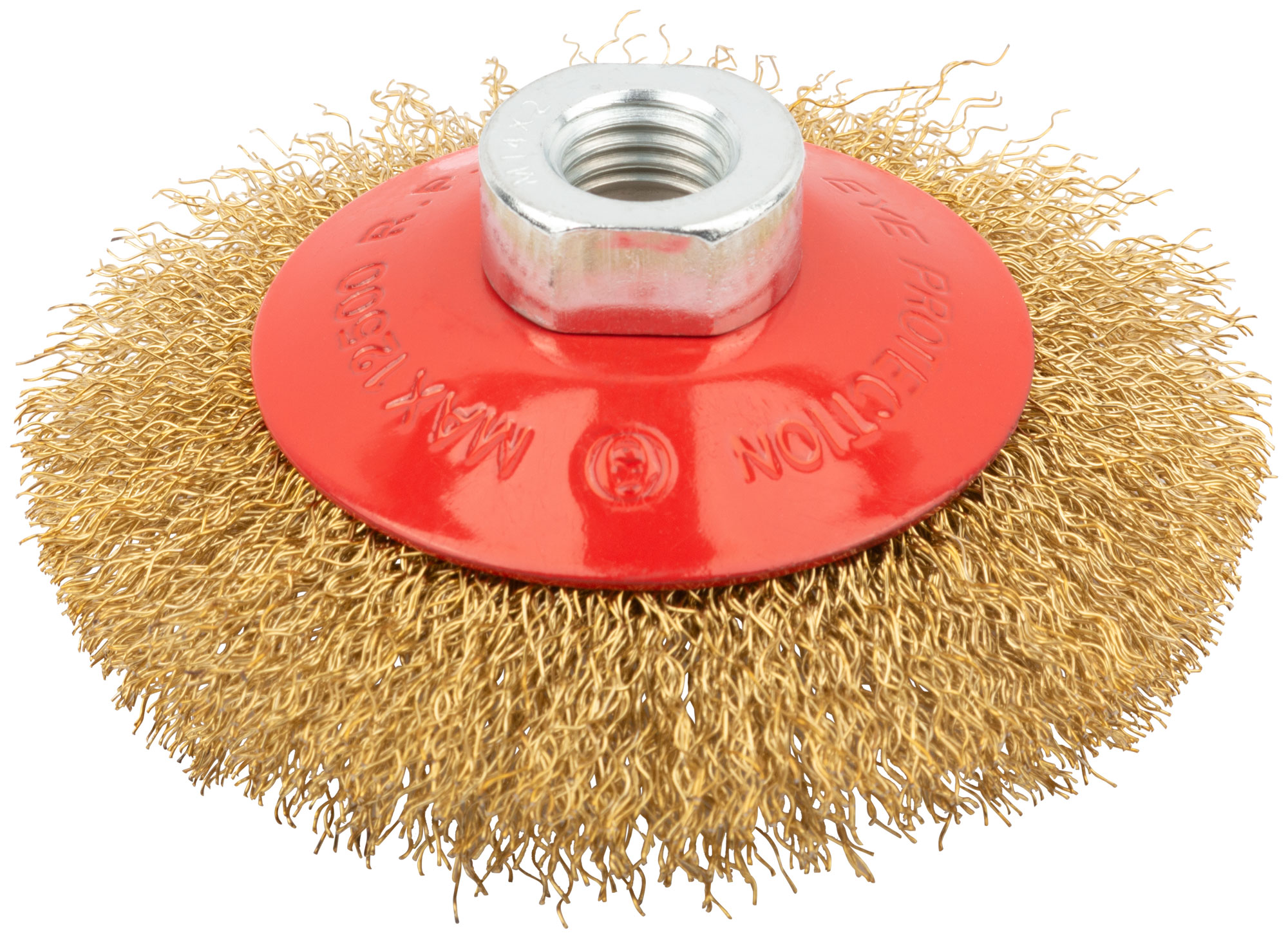 Купить Корщетка-колесо с наклоном, гайка М14, стальная латунированная волнистая проволока 100 мм по доступной цене в Москве