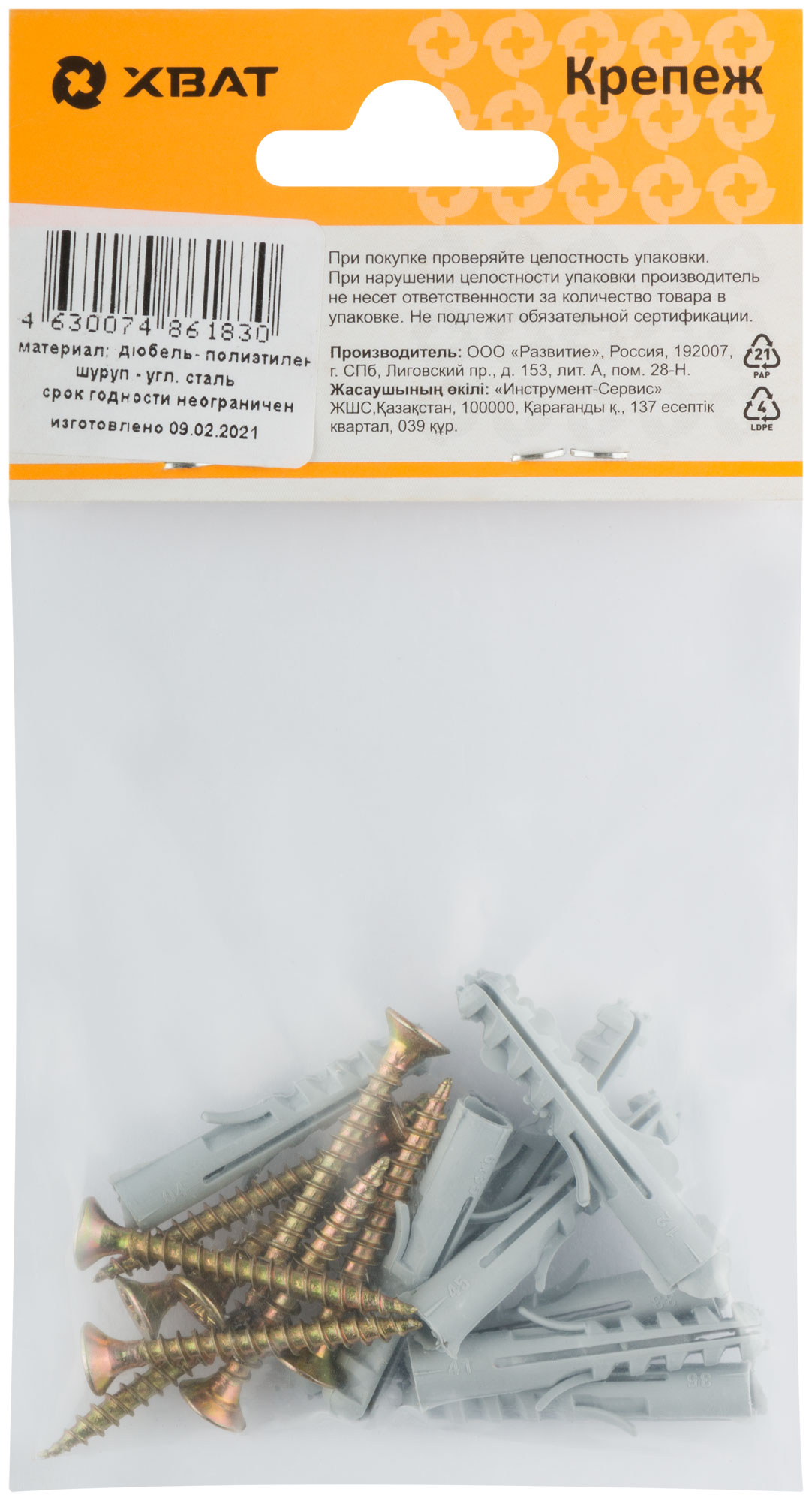 Дюбель изготовлен из полипропилена, шуруп - из стали. Используется для крепления плинтусов и других конструкций.