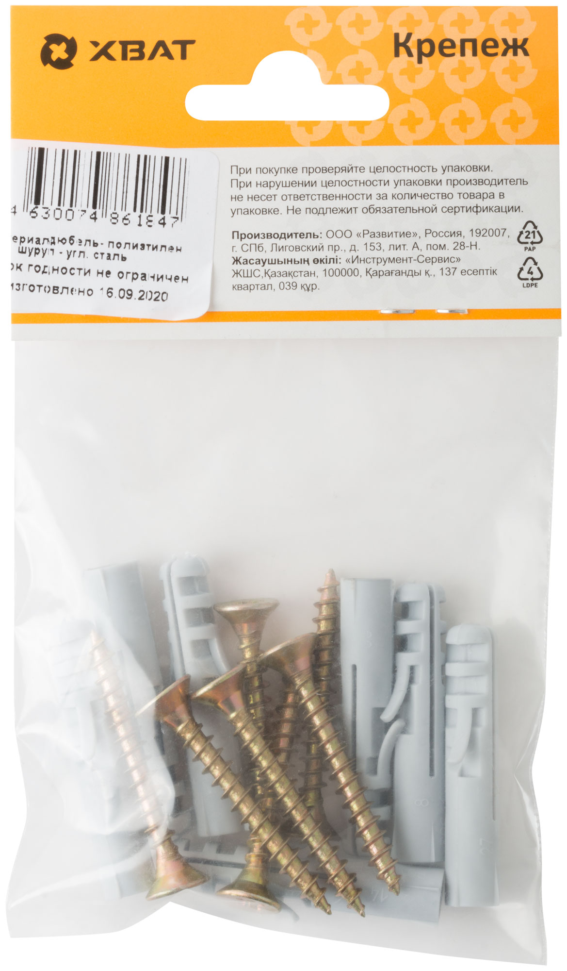 Дюбель изготовлен из полипропилена, шуруп - из стали. Используется для крепления плинтусов и других конструкций.