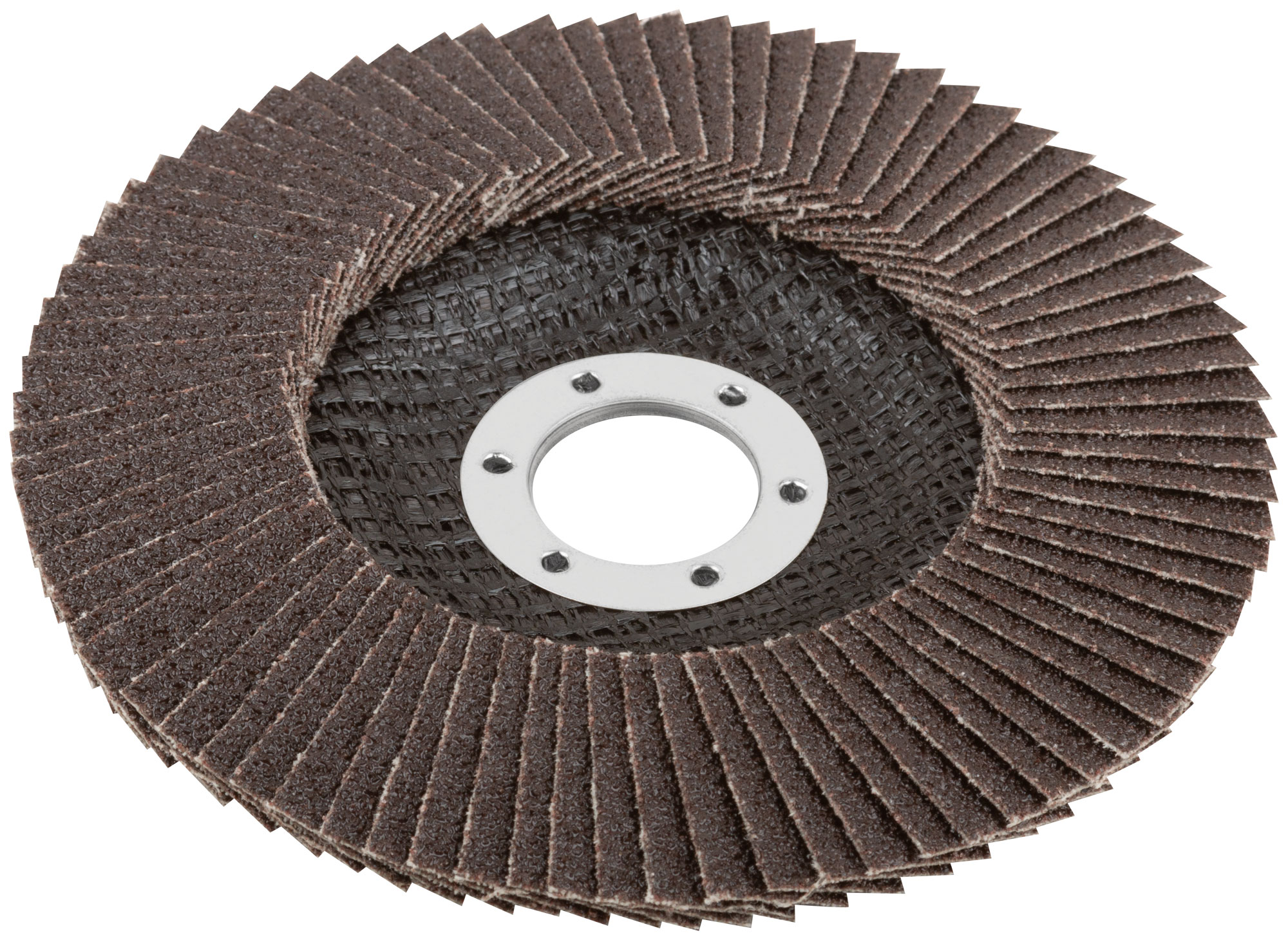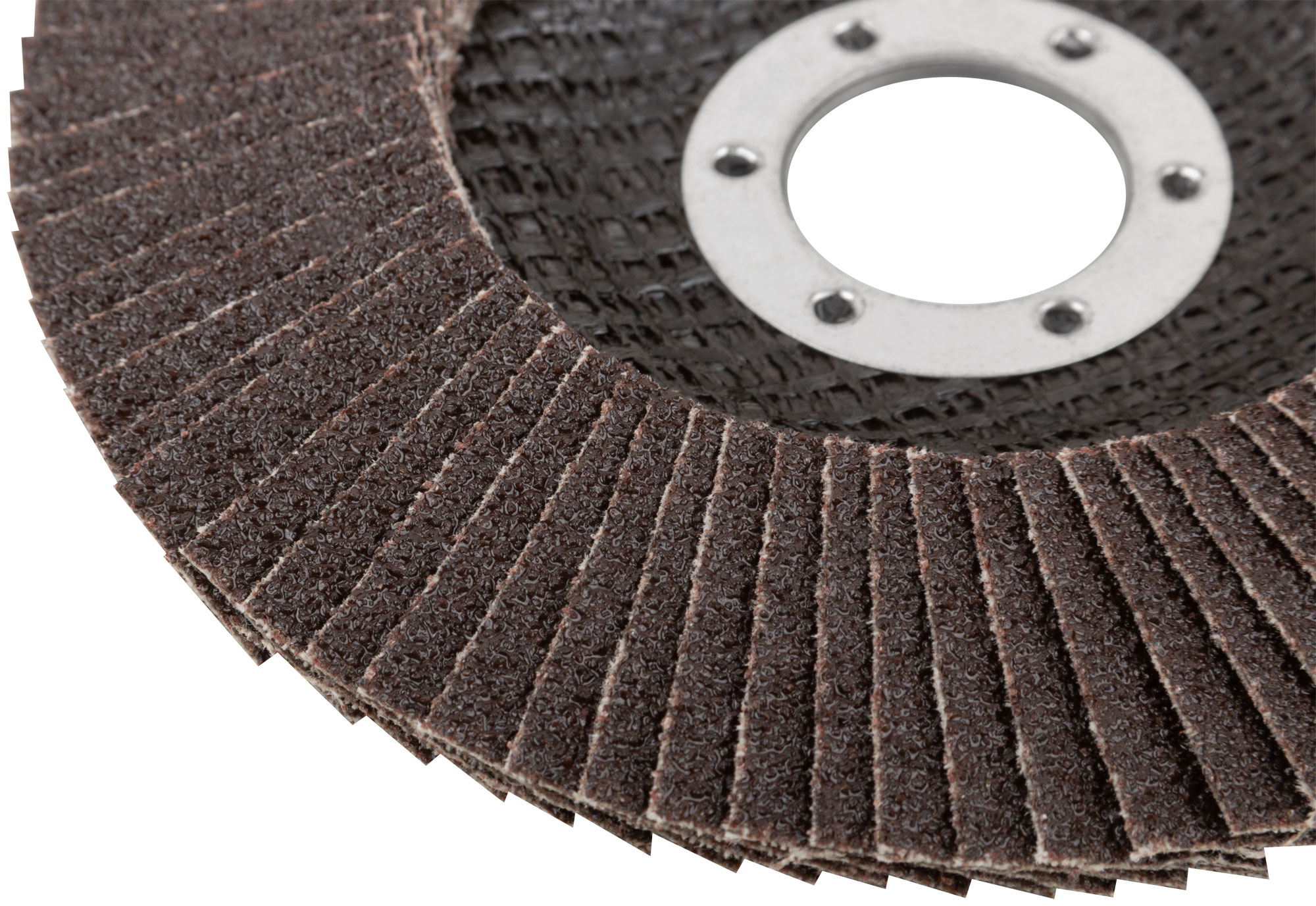 Тип 2 (Конический). 80 лепестков. Для УШМ. Посадочный диаметр 22,2 мм. Абразивный слой из кальцинированного оксида алюминия увеличивает скорость обработки поверхности. Для сухого шлифования и снятия краски с нержавеющей стали, инструментальной стали, чугуна, цветных металлов, пластика и дерева. Материал: абразивный слой - кальцинированный оксид алюминия, основа - х/б ткань, подложка - стекловолокно, обод - инструментальная сталь.