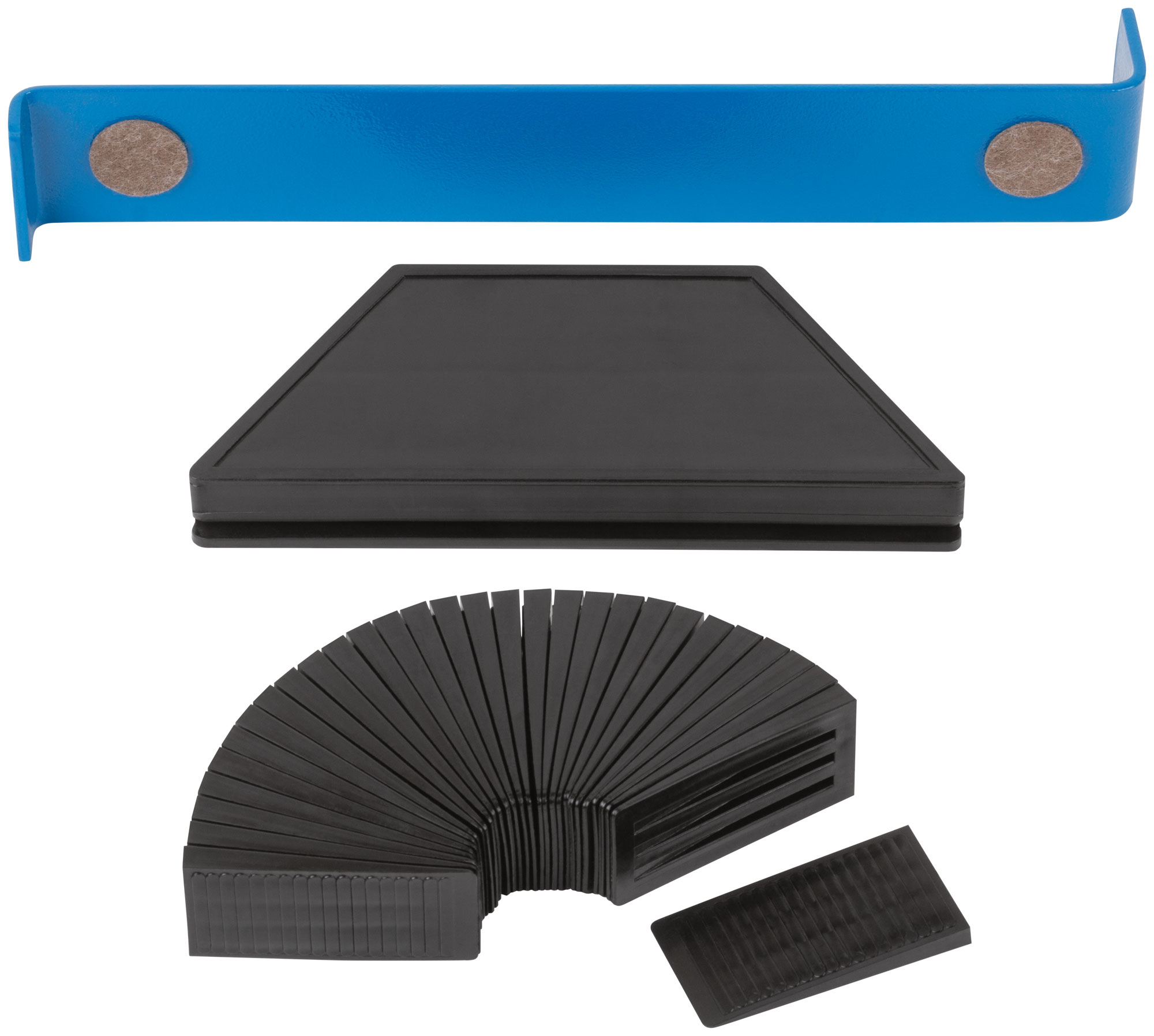 В наборе: пластиковый брусок, монтажная скоба, пластиковые клинья (30 9.). Регулировка рас-стояния между ламинатными панелями и стеной с помощью пластиковых клиньев, возможность работы в ограниченном пространстве. Материал: инструментальная сталь, пластик. Упаковка: п/э пакет с подвесом.