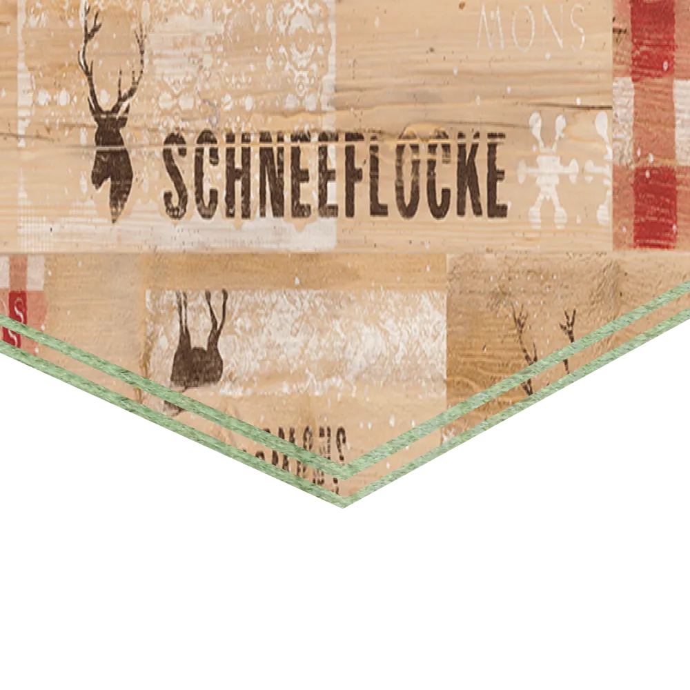 Декор плит выдержан в стиле скандинавских стран, в основе которого лежат сдержанность и уют, натуральность и естественность. Климат в этих странах суров и именно потому, для создания уютной и простой атмосферы, с давних пор используются теплые тона северных узоров. Композиция выполнена из состаренных досок в сочетании с классическими символами скандинавских стран – северным оленем и снежинками. Строительная плита Quick Deck Plus Хюгге - это влагостойкая шпунтованная ДСП, покрытая прочной декоративной плёнкой.