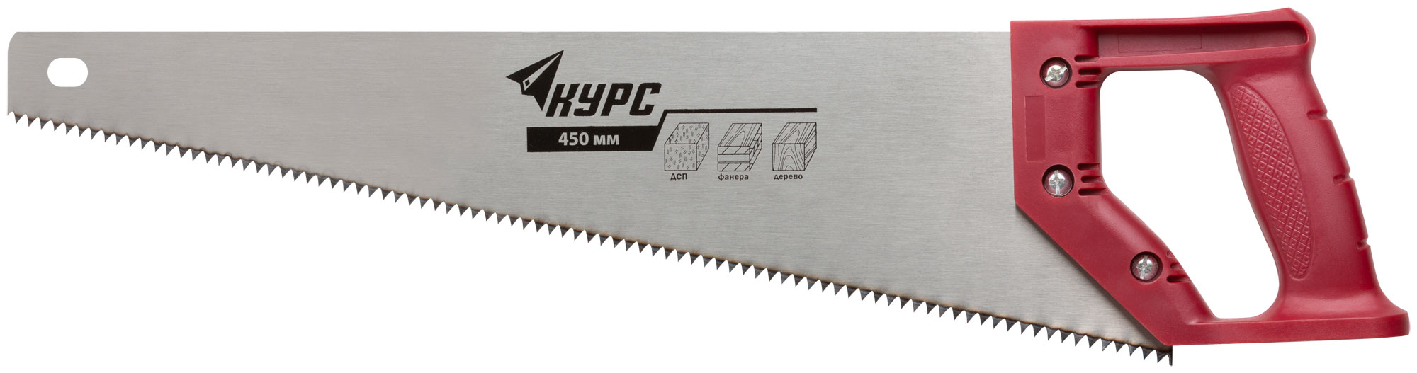 Средний зуб (7 TPI). Для работы с мягкими и твердыми породами древесины, фанерой, ДСП. Зубья с двугранной заточкой, разведены, имеют высокочастотную закалку. Материал: высокоуглеродистая сталь, пластиковая ручка.