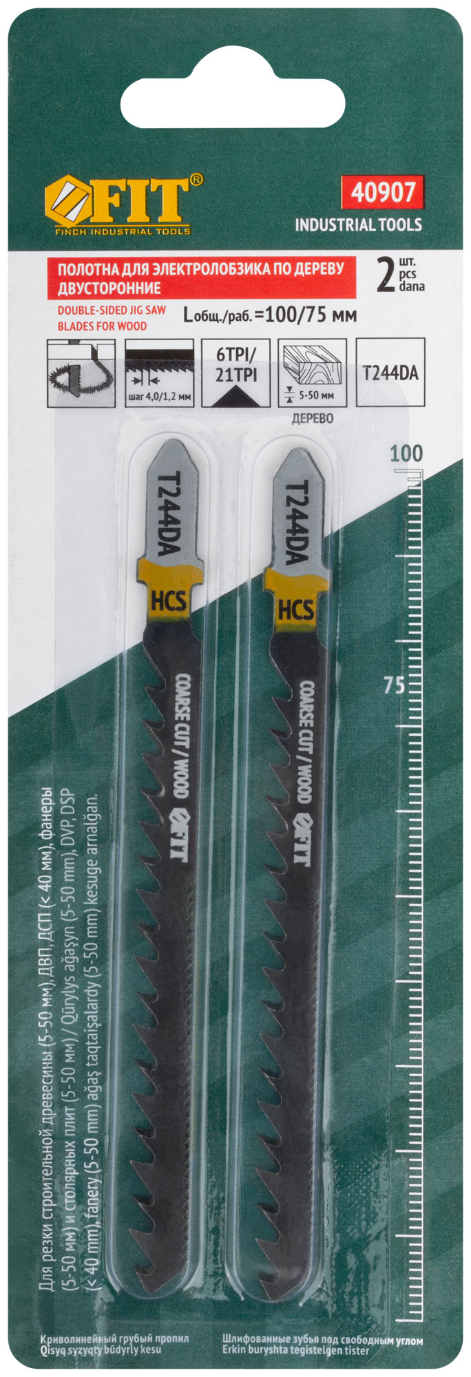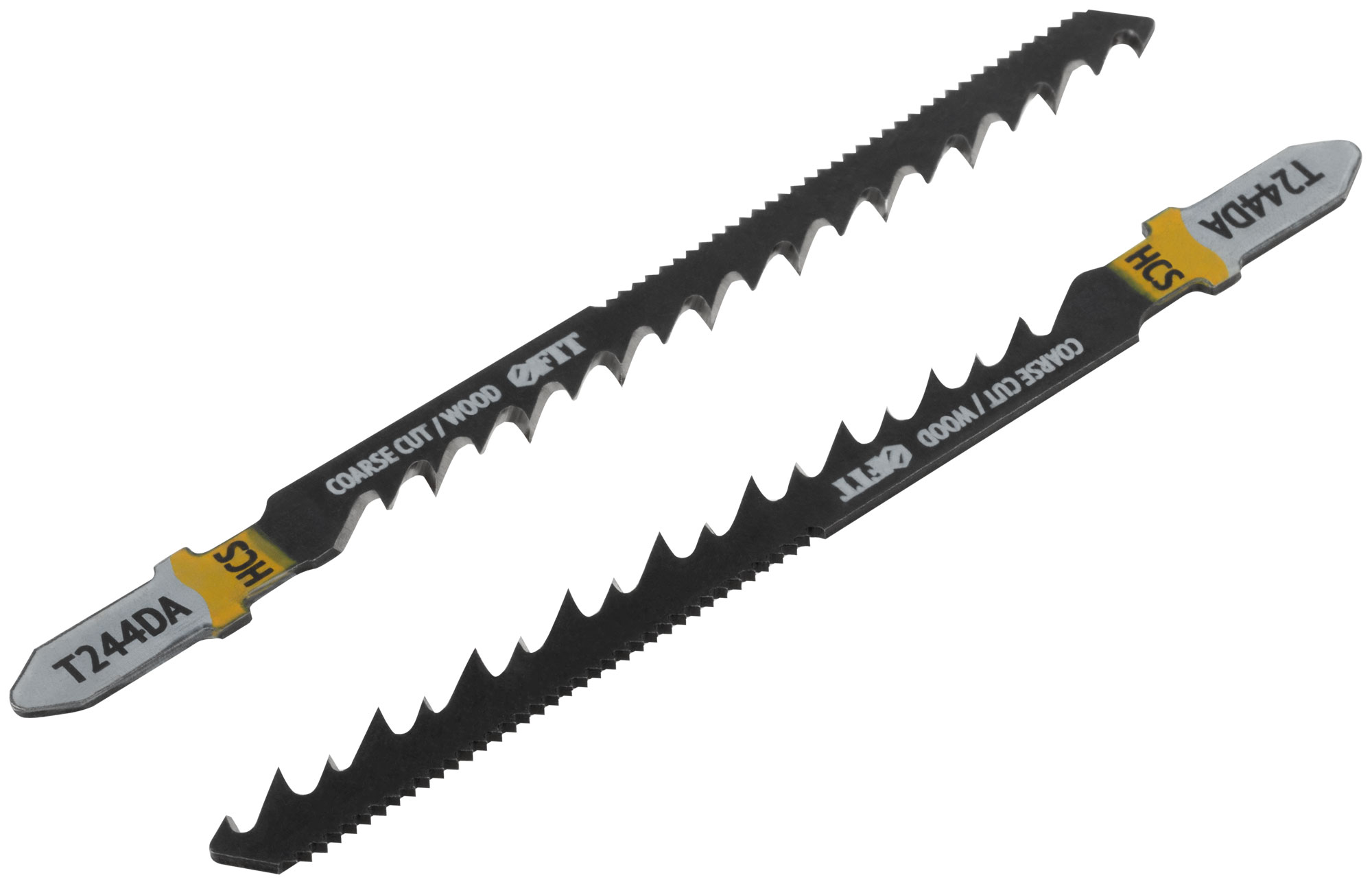 T244DA. Шлифованные зубья под свободным углом, задний угол заточен. Криволинейный грубый пропил. Дополнительный ряд зубьев с шагом 1,2 мм на обратной стороне полотна уменьшает радиус при пилении. Для резки строительной древесины, ДВП, ДСП, фанеры, столярных плит. Толщина реза: 5-50 мм. Материал: высокоуглеродистая инструментальная сталь. 9овка: блистер.