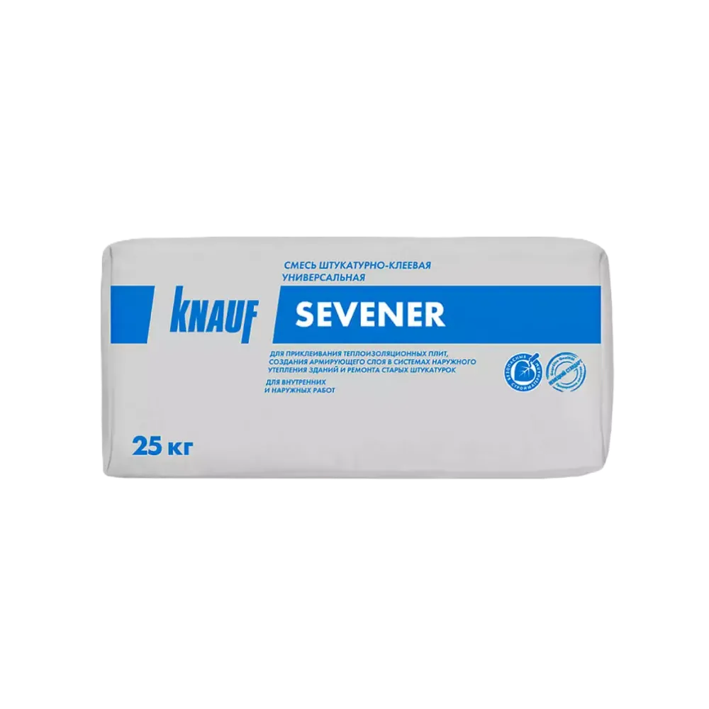 - Сухая смесь КНАУФ-Севенер содержит фракционированный песок, специальные волокна и полимерные добавки, которые обеспечивают готовому слою раствора высокую адгезию, трещиностойкость и водоотталкивающие свойства.