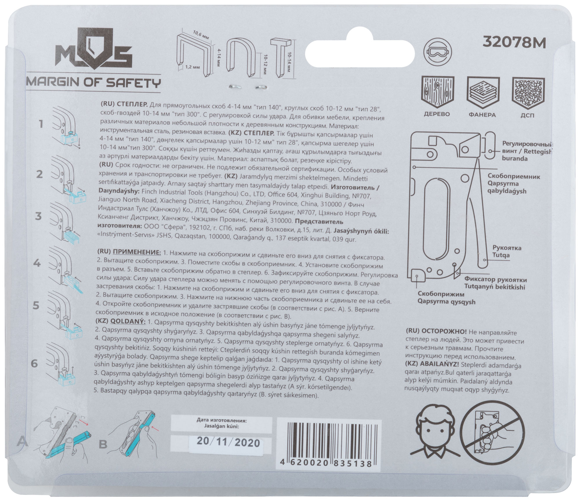 Для скоб ''Тип 140''(прямоугольные широкие), ''Тип 28'' (полукруглые), ''Тип 300''(скобы-гвозди), с регулировкой силы удара. Используется со скобами: 31206-31214, 31222, 31244. Упаковка: блистер.
