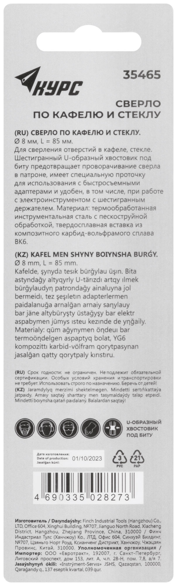 Купить Сверло по кафелю и стеклу, шестигранный U-хвостовик под биту 8х85 мм по доступной цене в Москве
