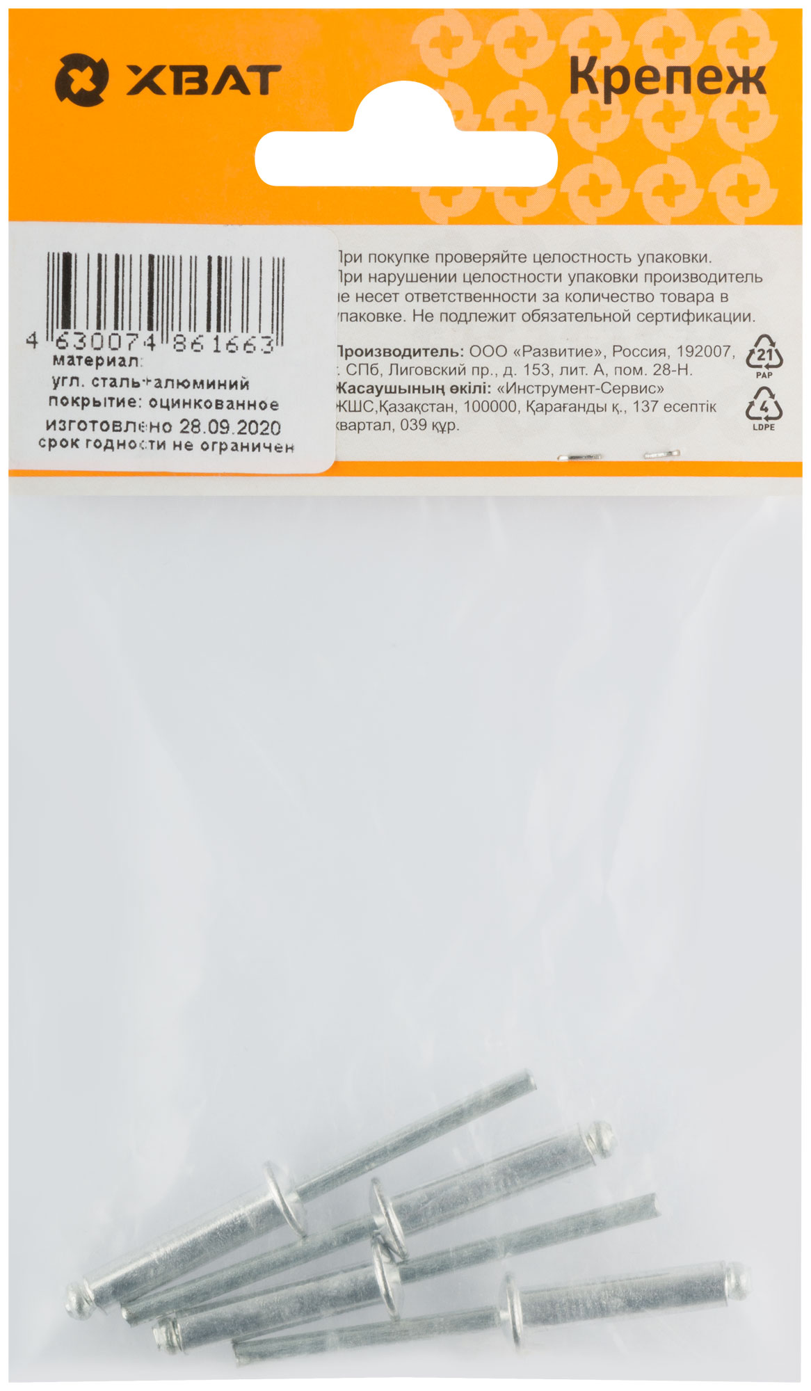 Купить Заклепки вытяжные комбинированные, алюминий-сталь 4.8 х 20 (фасовка 4 10) по доступной цене в Москве
