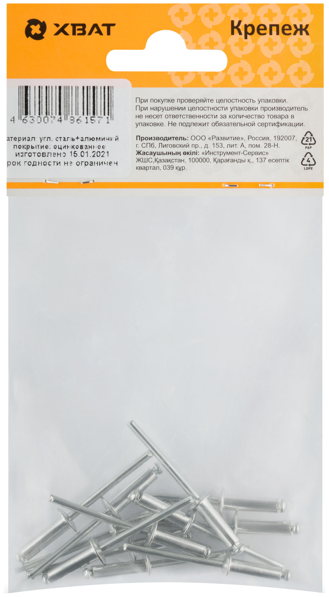 Предназначена для неразъемных соединения двух (или более) поверхностей. В процессе клепки образуется прочное, безопасное соединение. Конструкция корпуса заклепки обеспечивает большую силу сжатия материалов, а также поджимает соединяемые материалы, независимо от их толщины, в области сжатия. Материал: сердечник - сталь, рабочая часть - алюминий.