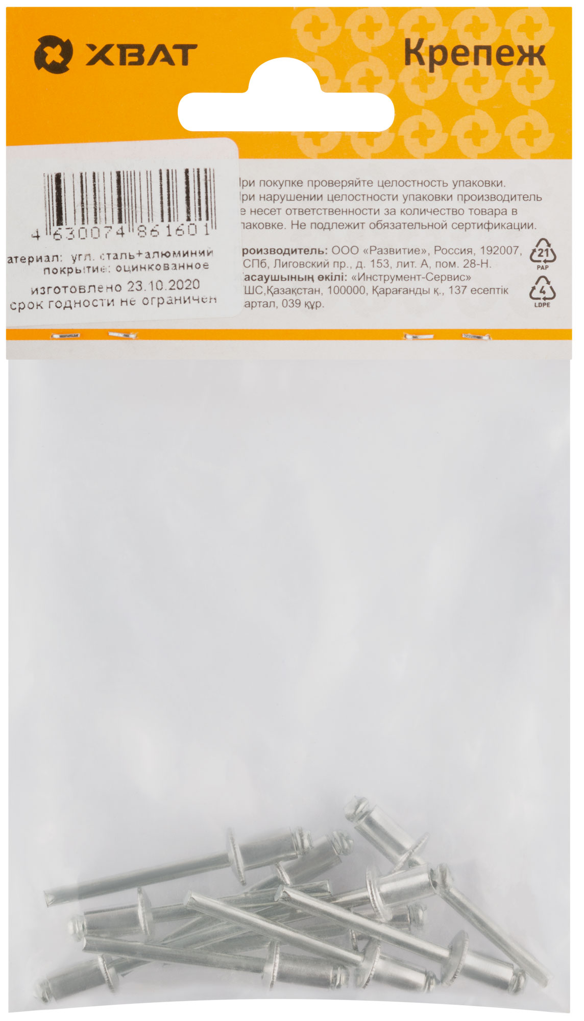 Предназначена для неразъемных соединения двух (или более) поверхностей. В процессе клепки образуется прочное, безопасное соединение. Конструкция корпуса заклепки обеспечивает большую силу сжатия материалов, а также поджимает соединяемые материалы, независимо от их толщины, в области сжатия. Материал: сердечник - сталь, рабочая часть - алюминий.